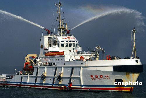 1月11日,中國(guó)交通部南海救助局在瓊州海峽開展救助值班船巡航護(hù)航和展示救助技能的演練,并部署隨時(shí)待命的海陸空專業(yè)救助力量,以確保春運(yùn)期間海峽航行安全。中新社發(fā) 善平 攝