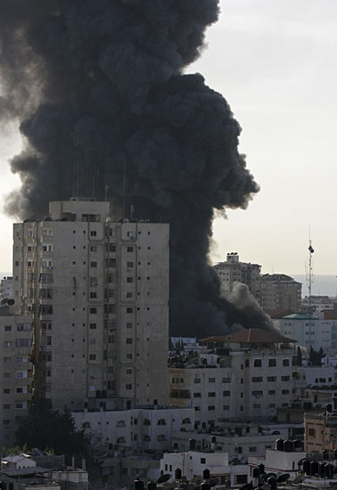 聯(lián)合國近東巴勒斯坦難民救濟(jì)和工程處位于加沙城的辦公地點(diǎn)遭以軍炮擊后煙霧沖天。