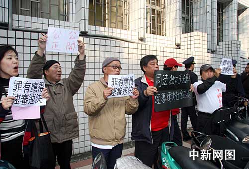 1月19日,臺(tái)北地方法院首次開庭審理前臺(tái)灣地區(qū)領(lǐng)導(dǎo)人陳水扁家弊案。傳訊陳水扁到地院準(zhǔn)備程序庭。有臺(tái)灣民眾今天在地院對面舉牌寫著“罪有應(yīng)得”。作者:陳立宇