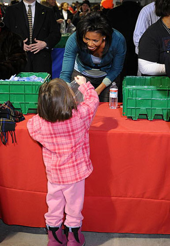 馬丁·路德·金全國(guó)紀(jì)念日,奧巴馬的夫人米歇爾在華盛頓的一個(gè)體育館內(nèi)幫助一名小志愿者。