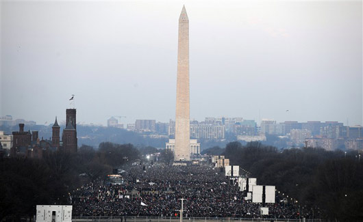 美國當(dāng)?shù)貢r間1月20日上午,華盛頓林肯紀(jì)念堂前的國家大草坪上擠滿了前來參加奧巴馬就職典禮的民眾。
