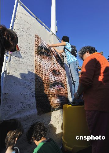 圖為觀眾在一個由紙鶴組成的奧巴馬總統(tǒng)像上簽名,表達(dá)和平心愿。