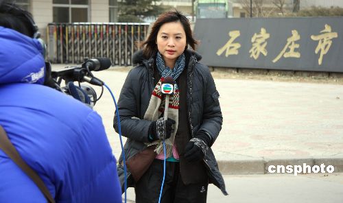 圖為當日上午,在石家莊中級法院門口,來自香港的電視臺記者冒著寒風(fēng)做現(xiàn)場報道。中新社發(fā) 翟羽佳 攝