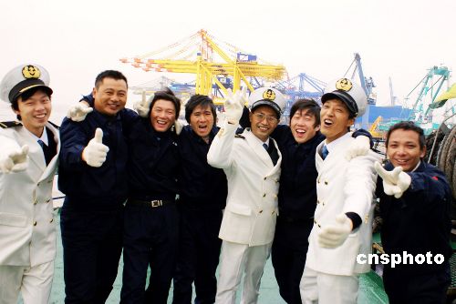 江蘇籍貫的“振華4號”船員斗志昂揚地在甲板上向江蘇家鄉(xiāng)父老歡呼。中新社發(fā) 李根 攝