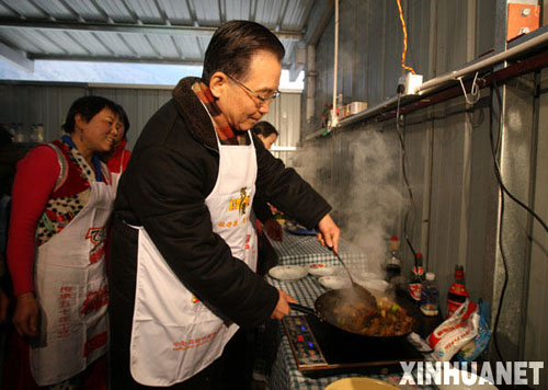 1月25日,溫家寶總理在汶川映秀鎮(zhèn)板房安置小區(qū)吳志遠(yuǎn)等幾家合用的廚房里炒菜。1月24日至25日,中共中央政治局常委、國務(wù)院總理溫家寶來到四川受災(zāi)最為嚴(yán)重的北川、德陽、汶川等地,和災(zāi)區(qū)人民一起過年。作者:姚大偉