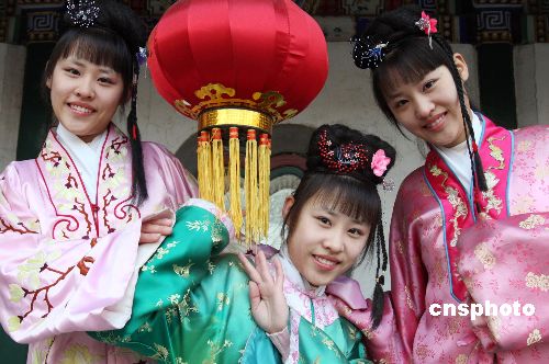 1月27日 (大年初二),北京大觀園十四屆紅樓廟會吸引眾多假日游客,本屆廟會以弘揚中華傳統(tǒng)文化為宗旨,以展現(xiàn)紅樓文化為主題,呈現(xiàn)出改革開放30年來新北京、新宣武的精神風(fēng)貌。廟會主要活動有“元妃省親”、“寶黛成婚”“賈母賀壽”、紅樓文化展覽--木版年畫展、紅樓夢人物火花展以及紅樓美食展示區(qū)等。圖為在北京大觀園2009年紅樓廟會上由三胞胎李鑫、李淼、李晶扮演的紅樓人物。中新社發(fā) 錢興強 攝