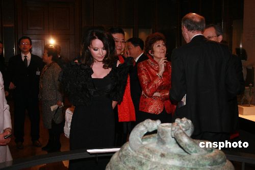 圖為布萊曼(左)在開幕式后參觀在大英博物館舉辦的“中國青銅玉器展”。