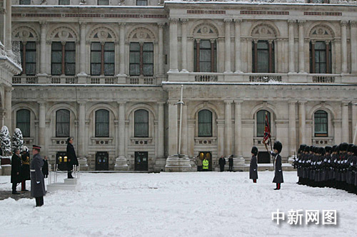 倫敦當(dāng)?shù)貢r間二月二日上午八時三十分許,正在對英國進行正式訪問的中國總理溫家寶,踏雪出席布朗首相在外交部舉行的歡迎儀式。圖為溫家寶在觀禮臺上檢閱儀仗隊。 中新社記者 張朔 攝