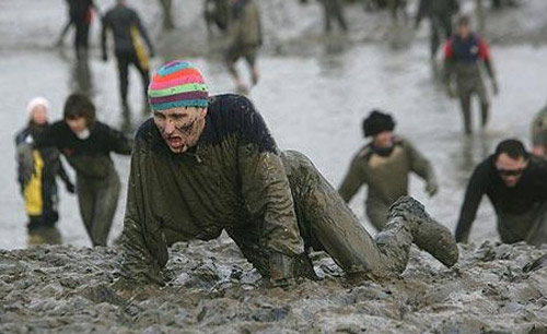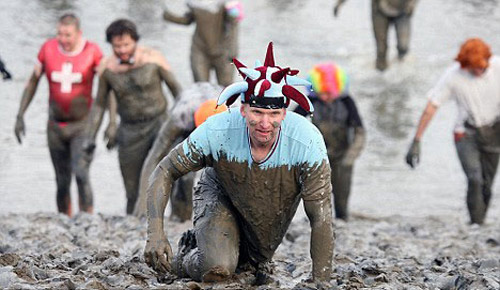泥潭賽跑:英國(guó)埃塞克斯郡舉行的瘋狂泥潭賽跑大賽,200多名參賽者打扮成小丑、牛仔或圣誕老人的樣子,在黑乎乎的泥巴中盡情“狂奔”。