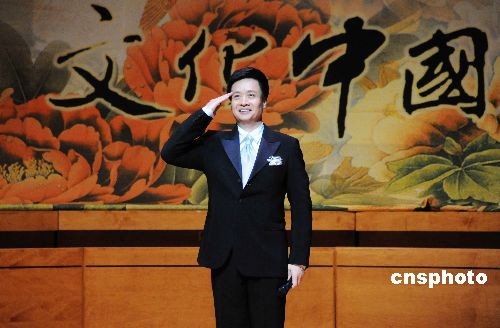 圖為閻維文在演唱《一二三四歌》時向觀眾行禮。中新社發(fā) 邱江波 攝