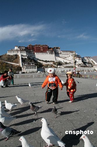 布達(dá)拉宮廣場(chǎng)上的孩童與鴿子。中新社發(fā) 扎西朗杰 攝