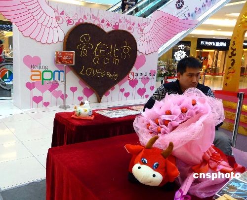 2009年2月11日,北京王府井各商場紛紛營造出濃郁的情人節(jié)氣氛,迎接西方情人節(jié)的到來。 中新社發(fā) 玉龍 攝