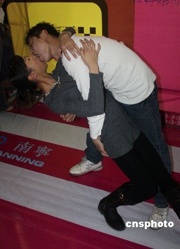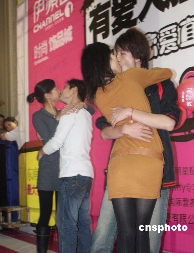 2月14日晚,廣西南寧市一家商場(chǎng)舉辦的接吻大賽中,六對(duì)情侶不斷變換各式接吻姿勢(shì)一決高低。最終一對(duì)“90后”最終憑借千奇百怪的接吻姿勢(shì),在激吻近半小時(shí)后奪冠。中新社發(fā) 王剛 攝