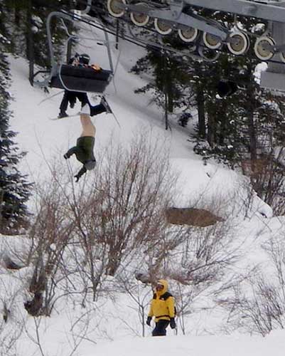 1月6日,美國科羅拉多一處滑雪場日前上演了一出尷尬場面。一名男子在上纜車時,因座椅故障,整個人頭朝下翻轉(zhuǎn)了下來,所幸他的雪橇將他卡在纜車上,沒有掉下來。但是令人尷尬的是,他的褲子被扯下來,整個下半身暴露在冰雪寒風(fēng)中,直到15分鐘后才有工作人員將他救下來。