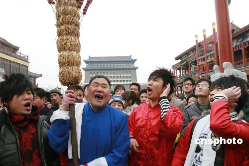 2009年2月17日,遼寧衛(wèi)視在北京前門大街步行街拍攝反映老北京民俗節(jié)目的現(xiàn)場,花兒樂隊的成員向“京城叫賣大王”臧鴻學習“老北京叫賣”絕活,吸引了眾多游客駐足觀看。中新社發(fā) 陳曉根 攝