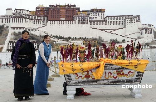 2月23日,拉薩布達(dá)拉宮廣場(chǎng)布置巨型“切瑪”迎接藏歷新年,F(xiàn)場(chǎng)這位藏族老阿媽稱(chēng)這是她見(jiàn)過(guò)的最大的“切瑪”。藏歷新年時(shí),藏族民眾家家戶(hù)戶(hù)供“切瑪”,人人都嘗“切瑪”。當(dāng)客人走進(jìn)藏民家時(shí),主人首先會(huì)獻(xiàn)“切瑪”,客人從堆放在“缽”中的“切瑪”里拿出一點(diǎn)兒來(lái),并說(shuō)“扎西德勒”(吉祥如意之意),爾后放進(jìn)嘴里,預(yù)祝新春如意、身體康健。