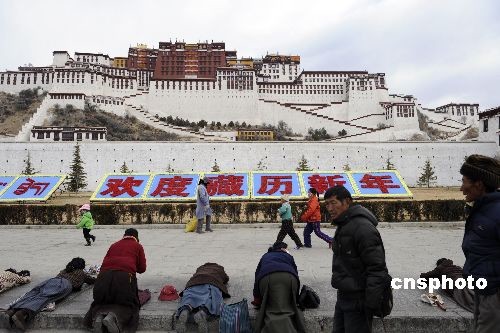 2月23日,拉薩布達(dá)拉宮廣場(chǎng)布置“歡度藏歷新年”的巨型標(biāo)語(yǔ),節(jié)日氣氛濃郁,許多藏民在路邊向著高聳的布達(dá)拉宮叩拜。中新社發(fā) 廖攀 攝