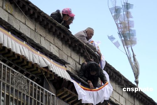 2月24日,中國藏歷年三十,西藏拉薩八角街的居民在更換屋檐上的仙布,以迎接藏歷新年的到來。中新社發(fā) 廖攀 攝