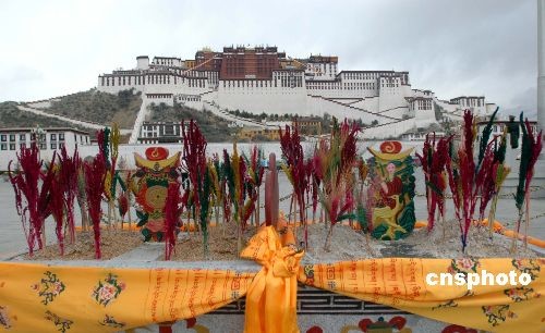 藏歷新年期間,風景秀麗的布達拉宮廣場上供奉了幾只大型的“切瑪”,象征著五谷豐登、風調雨順和吉祥如意的美好愿景。供奉“切瑪”是藏族民眾的新年傳統(tǒng)習俗,切瑪盒內一頭裝有拌好的酥油糌粑,另一頭裝滿小麥,壘成金字塔型,中間插上一朵花或酥油制的“字珠”。中新社發(fā) 周波 攝