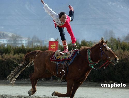 2月27日,拉薩賽馬場(chǎng)上演一年一度的傳統(tǒng)賽馬表演,西藏馬術(shù)隊(duì)的女騎手精湛的技藝博得了場(chǎng)內(nèi)觀眾的陣陣喝彩。中新社發(fā) 劉震 攝