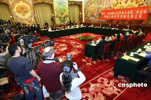 3月6日,十一屆全國人大二次會議西藏自治區(qū)代表團在人民大會堂舉行全體會議,吸引眾多中外媒體的記者。中新社發(fā) 杜洋 攝
