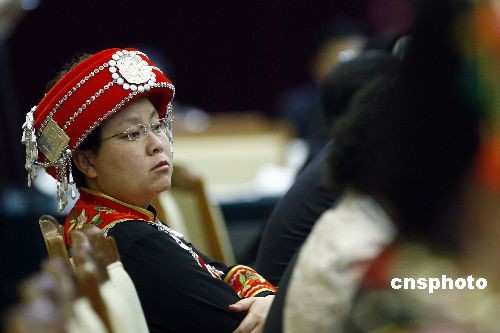 3月7日,十一屆全國人大二次會議繼續(xù)舉行小組會,審議政府工作報告。在云南代表團(tuán)小組討論中,彝族代表?xiàng)顏喢飞碇?jié)日盛裝出席小組會。中新社發(fā) 盛佳鵬 攝