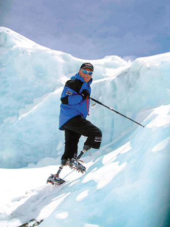 “無(wú)腿人”征服世界最高峰。47歲的新西蘭人馬克·英格利斯于2006年曾成功登頂珠穆朗瑪峰,成為世界上第一位登上世界最高峰的雙腿殘疾者。英格利斯是一個(gè)傳奇人物。1982年,在攀登新西蘭最高峰庫(kù)克峰時(shí),他的雙腿被凍壞。截肢后的英格利斯改練自行車(chē),并獲得殘奧會(huì)銀牌。但是,他從未放棄登山夢(mèng)想,終于在2006年5月15日夢(mèng)想成真。用英格利斯妻子的話(huà)說(shuō),“登頂那一刻,他摸到了天”。