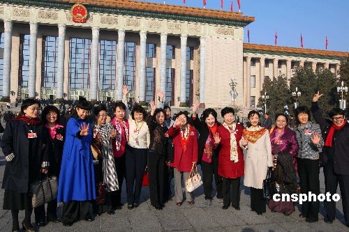 3月8日,全國(guó)政協(xié)十一屆二次會(huì)議第三次全體會(huì)議在北京人民大會(huì)堂舉行,參加會(huì)議的女委員在大會(huì)堂前合影,慶祝國(guó)際婦女節(jié)。中新社發(fā) 盛佳鵬 攝