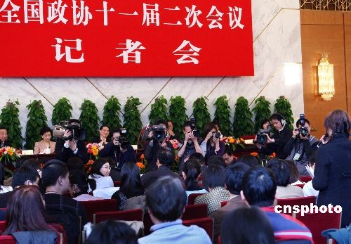 3月8日全國政協(xié)十一屆二次會議舉行記者會,主題是“政協(xié)委員談上海世博會”。萬季飛、周漢民、成岳沖、楊瀾等四位全國政協(xié)委員就上海世博會的經(jīng)濟效應及國際國內(nèi)參與上海世博會等回答了中外記者提問。中新社發(fā) 宋吉河 攝