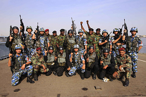中國海軍特戰(zhàn)隊(duì)員、巴基斯坦海軍特戰(zhàn)隊(duì)員和尼日利亞海軍特戰(zhàn)隊(duì)員在海上直升機(jī)滑降演習(xí)現(xiàn)場合影。查春明 攝