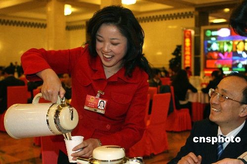 3月10日下午,十一屆全國(guó)人大二次會(huì)議在北京人民大會(huì)堂舉行第三次全體大會(huì),聽取最高人民法院和最高人民檢察院的工作報(bào)告。會(huì)前,上海代表團(tuán)的打工妹代表朱雪芹臨時(shí)“改行”,熱情地為其他代表沏茶倒水。中新社發(fā) 任晨鳴 攝 點(diǎn)擊進(jìn)入2009兩會(huì)圖片報(bào)道專集