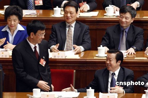 3月10日,十一屆全國人大二次會議在北京人民大會堂舉行第三次全體會議,最高人民法院院長王勝俊、最高人民檢察院檢察長曹建明分別作工作報(bào)告。圖為曹建明作完報(bào)告回到座位后與王勝俊握手。中新社發(fā) 盛佳鵬 攝