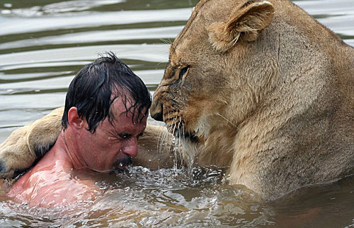 據(jù)悉,34歲的理查德森是一位動物行為學家,他能夠與人類認為最危險的動物十分融洽地生活在一起。這頭名叫“瑪格麗塔”的母獅重達185公斤,它很喜歡與理查德森開玩笑,時常將河中的水撥濺在他的身上,還在河中與他相擁相抱,有時將前爪搭在他的肩膀上。