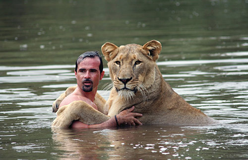 凱文·理查德森與自己的好友——重達(dá)185公斤的母獅一起戲水。