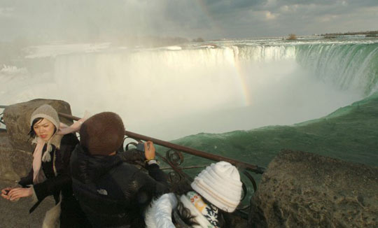 圍觀游客向瀑布下張望。