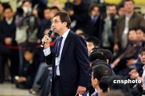 3月13日,十一屆全國人大二次會議閉幕后,國務(wù)院總理溫家寶在北京人民大會堂與中外記者見面。美國《華爾街日報(bào)》記者就中國分散投資風(fēng)險的策略、能否保證中國不會讓人民幣貶值、中國會不會向國際貨幣基金組織提供資金支持,向溫總理提出三問。中新社發(fā) 傅丹丹 攝