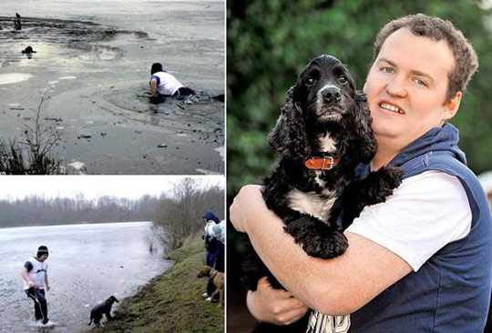 狗主人破冰救寵。據(jù)英國媒體報道,有時人類最好的朋友也需要朋友。因此,當(dāng)馬克(Marc Greenhalgh)的可卡犬賈維斯(Jarvis)被困在結(jié)冰的湖中時,他義無反顧的跳進去拯救它。