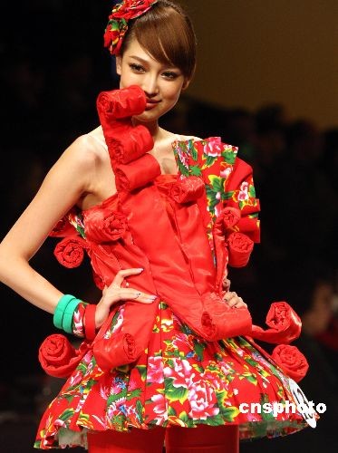 3月24日,中國國際時裝周(09/10秋冬系列)在北京隆重開幕,本屆時裝周將在D.PARK北京會所、北京飯店等主場地舉辦為期一周的專場發(fā)布、專項(xiàng)大賽、專題論壇等專業(yè)活動近40項(xiàng),時裝周將期間將有來自國內(nèi)外的近20個知名品牌舉辦流行趨勢發(fā)布。圖為在開幕式上舉行“漢帛獎”第17屆中國國際青年設(shè)計(jì)師時裝大賽作品展示。中新社發(fā) 錢興強(qiáng) 攝