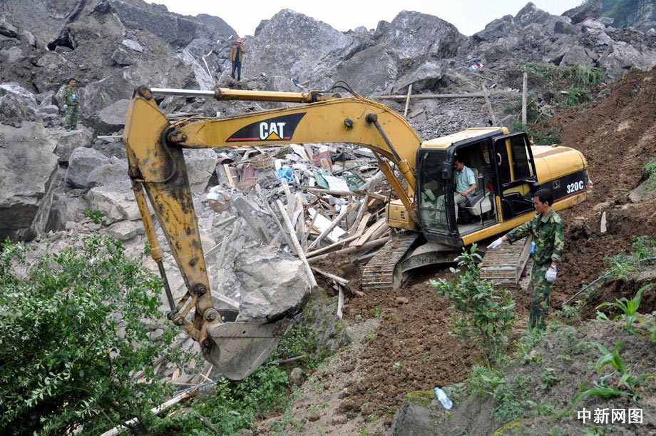 因垮塌的民房為兩層樓混泥土結(jié)構(gòu),且上有土石堆積,只攜帶了簡易救援工具的救援官兵難以快速搜救被埋者。6月7日15時許,第一臺型號為CAT320C的中型挖掘機駛進垮塌現(xiàn)場進行挖掘作業(yè)。 曹多然 攝