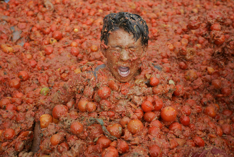 2009年6月14日,哥倫比亞第五屆番茄狂歡節(jié)開幕,參與者互相投擲西紅柿,盡情狂歡慶豐收。來自哥倫比亞各地的狂歡者們云集在首都波哥大東北部的蘇塔馬錢小鎮(zhèn),街道上立刻變成了西紅柿紛飛的戰(zhàn)場。雖然每個人的臉上身上沾滿了西紅柿汁,但人們還是樂此不疲又是丟又是砸,把成堆的西紅柿當(dāng)成打仗的“武器”。還有人特地穿上白衣白褲,身上越紅,心里就越痛快。