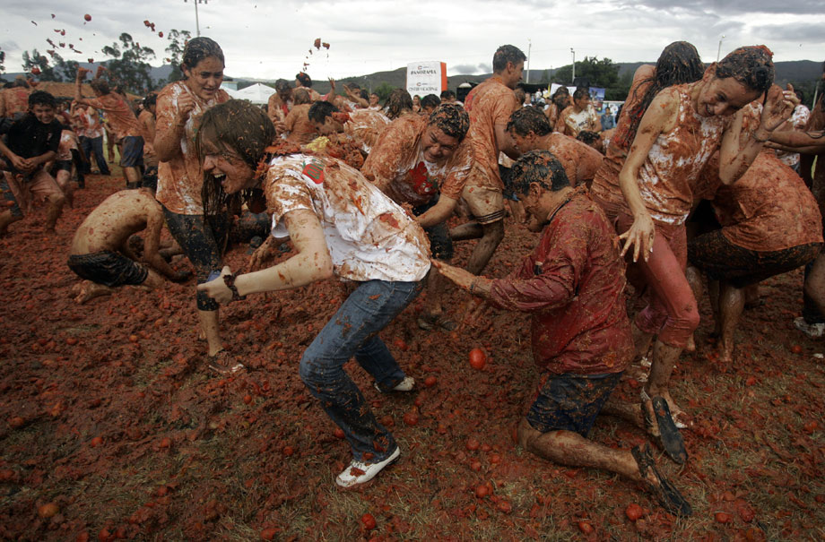 2009年6月14日,哥倫比亞第五屆番茄狂歡節(jié)開幕,參與者互相投擲西紅柿,盡情狂歡慶豐收。來自哥倫比亞各地的狂歡者們云集在首都波哥大東北部的蘇塔馬錢小鎮(zhèn),街道上立刻變成了西紅柿紛飛的戰(zhàn)場。雖然每個人的臉上身上沾滿了西紅柿汁,但人們還是樂此不疲又是丟又是砸,把成堆的西紅柿當成打仗的“武器”。還有人特地穿上白衣白褲,身上越紅,心里就越痛快。