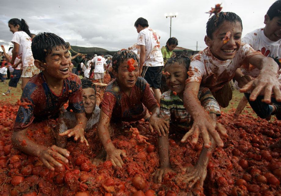 2009年6月14日,哥倫比亞第五屆番茄狂歡節(jié)開幕,參與者互相投擲西紅柿,盡情狂歡慶豐收。來自哥倫比亞各地的狂歡者們云集在首都波哥大東北部的蘇塔馬錢小鎮(zhèn),街道上立刻變成了西紅柿紛飛的戰(zhàn)場。雖然每個人的臉上身上沾滿了西紅柿汁,但人們還是樂此不疲又是丟又是砸,把成堆的西紅柿當(dāng)成打仗的“武器”。還有人特地穿上白衣白褲,身上越紅,心里就越痛快。