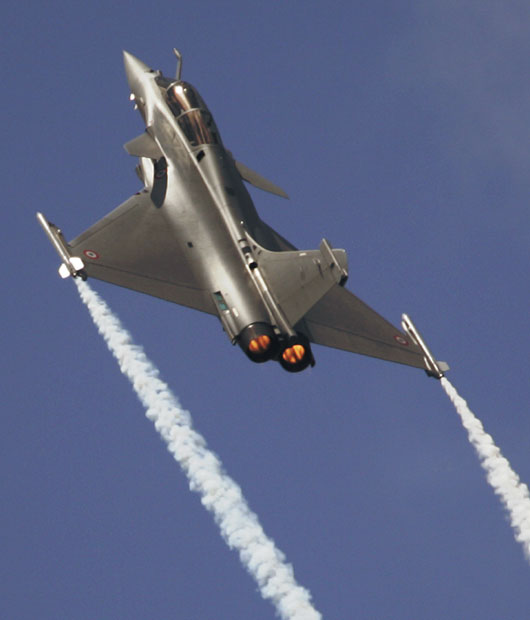 圖為法國陣風戰(zhàn)斗機進行飛行表演。