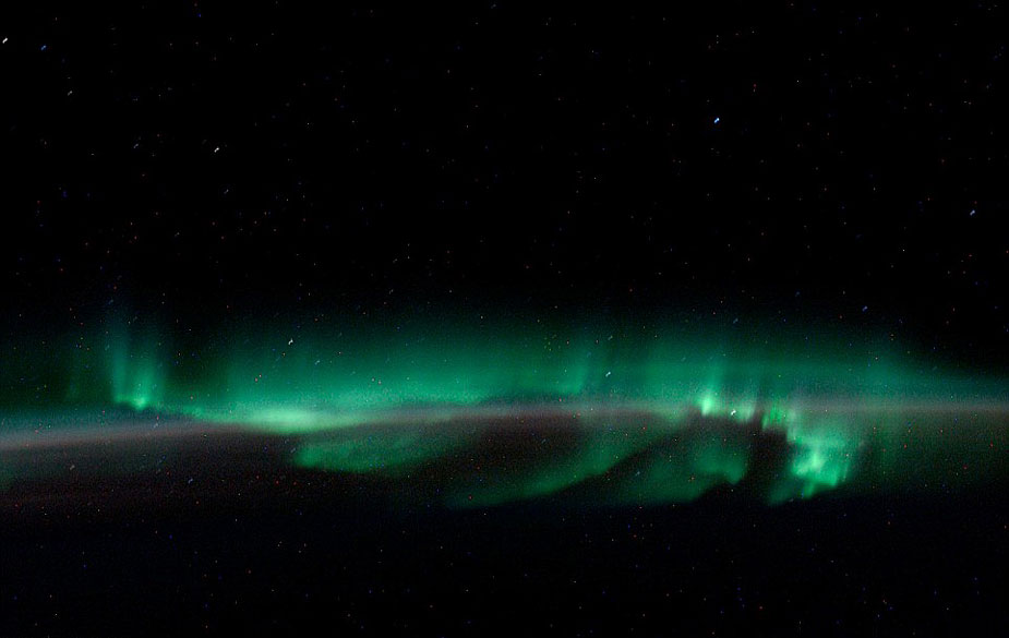 在兩極上空大氣層以上數(shù)十公里的太空,極光現(xiàn)象仍能被清楚地觀測(cè)到。紅色、綠色的極光閃爍著怪異的微弱綠光,好似鬼怪之光,給人以寒冷的感覺(jué)。在繞地軌道上的宇航員用長(zhǎng)曝光相機(jī)和35毫米膠片拍攝下了這些怪異的圖片。