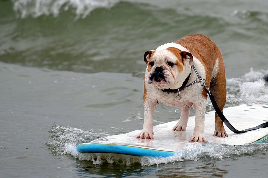 6月20日,在美國(guó)加利福尼亞州帝國(guó)沙灘舉行了一場(chǎng)小狗沖浪比賽,小狗們表現(xiàn)得十分認(rèn)真。