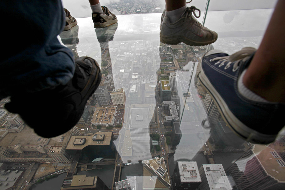 7月1日,美國(guó)芝加哥,西爾斯大廈在第103層瞭望臺(tái)增設(shè)的玻璃陽臺(tái)對(duì)媒體開放。這些玻璃陽臺(tái)建在大廈西側(cè),從瞭望臺(tái)向外延伸約1.2米。陽臺(tái)的玻璃地板厚達(dá)12.7厘米,可承重約5噸。