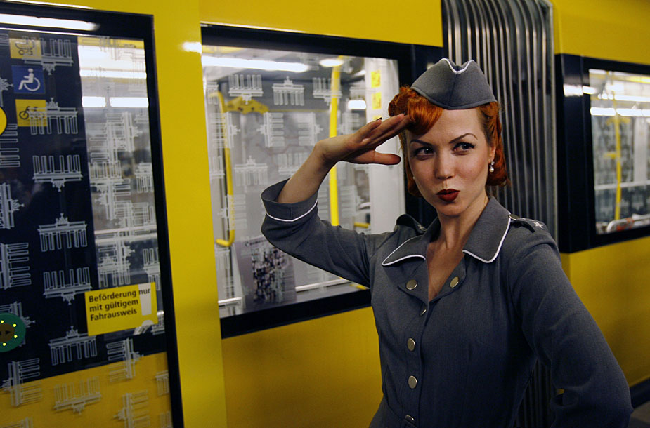 7月2日,模特在德國首都柏林的一輛地鐵上,演繹名為“地鐵上的貓步”時裝秀。