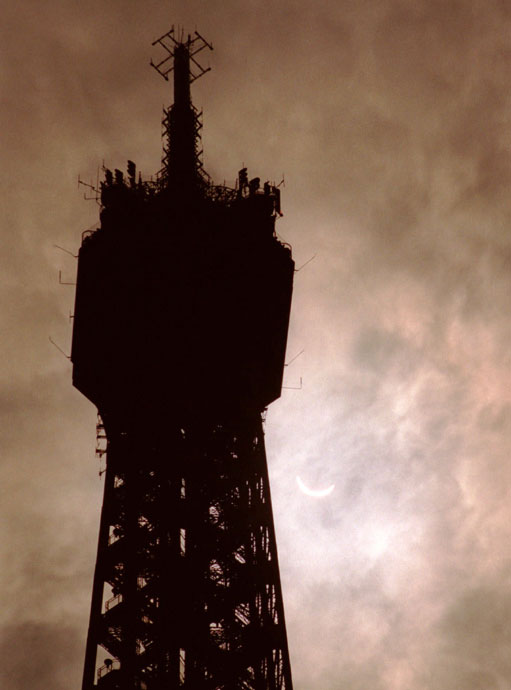 圖為1999年8月1日在法國埃菲爾鐵塔旁觀測到得日全食景觀的發(fā)生過程。