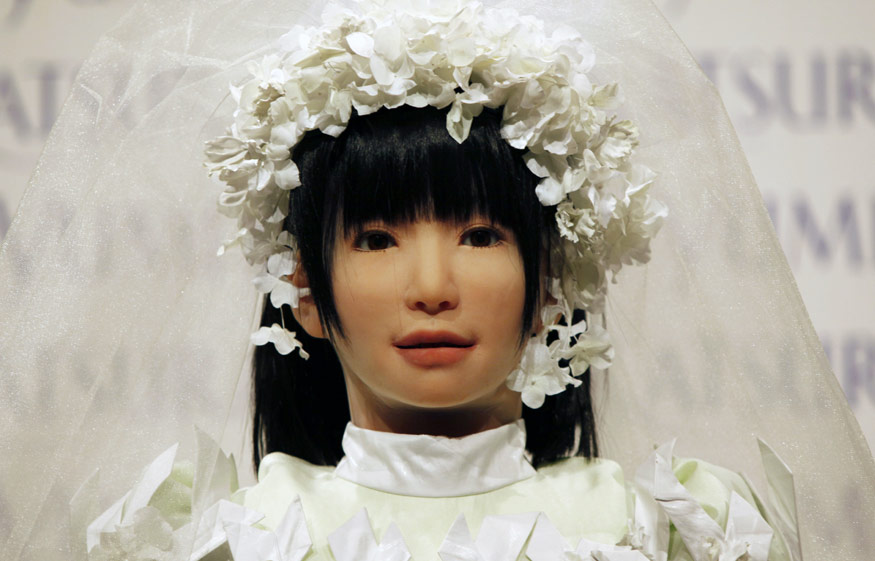 7月22日,日本大阪,類人機器人“HRP-4C”身穿由著名婚紗設計師為其量身定做的婚紗亮相。>>點擊觀看視頻