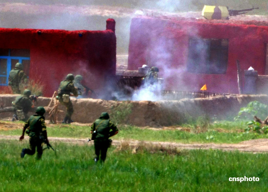 中國、俄羅斯兩軍總參謀長,7月23日上午到沈陽軍區(qū)洮南合同戰(zhàn)術(shù)訓(xùn)練基地,觀看“和平使命2009”聯(lián)合反恐軍事演習(xí)。雙方以陸軍和空軍為主,中方參演部隊包括1個陸軍戰(zhàn)斗群和1個空軍戰(zhàn)斗群。俄方參演兵力包括1個陸軍加強摩步營、1個空降突擊連和部分空軍兵力,雙方投入兵力兩千多人。中新社發(fā) 宋吉河 攝